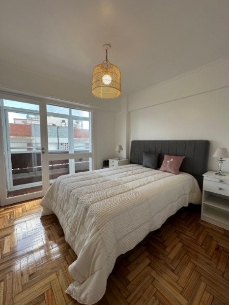 Dormitorio principal piso parquet plastificado, calefactor, somier 2 plz, placard, salida al balcón corrido.