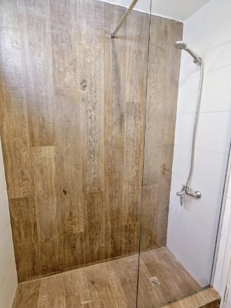 Baño con vanitory, ducha con mampara de vidrio y ventilación natural.