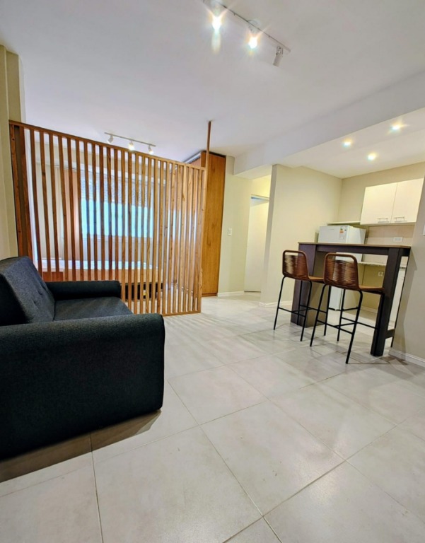 Living comedor a la calle con balcón saliente piso porcelanato, calefactor.
